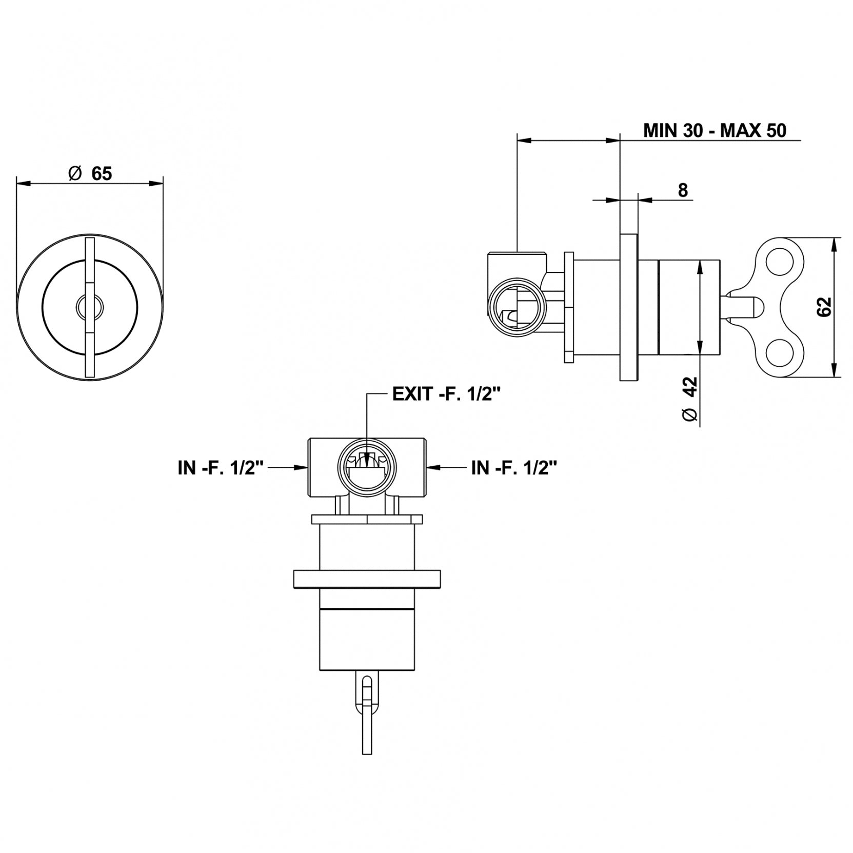 Aqua Built-in thermostatic mixer with 3 open/close taps on single plate (3 way).