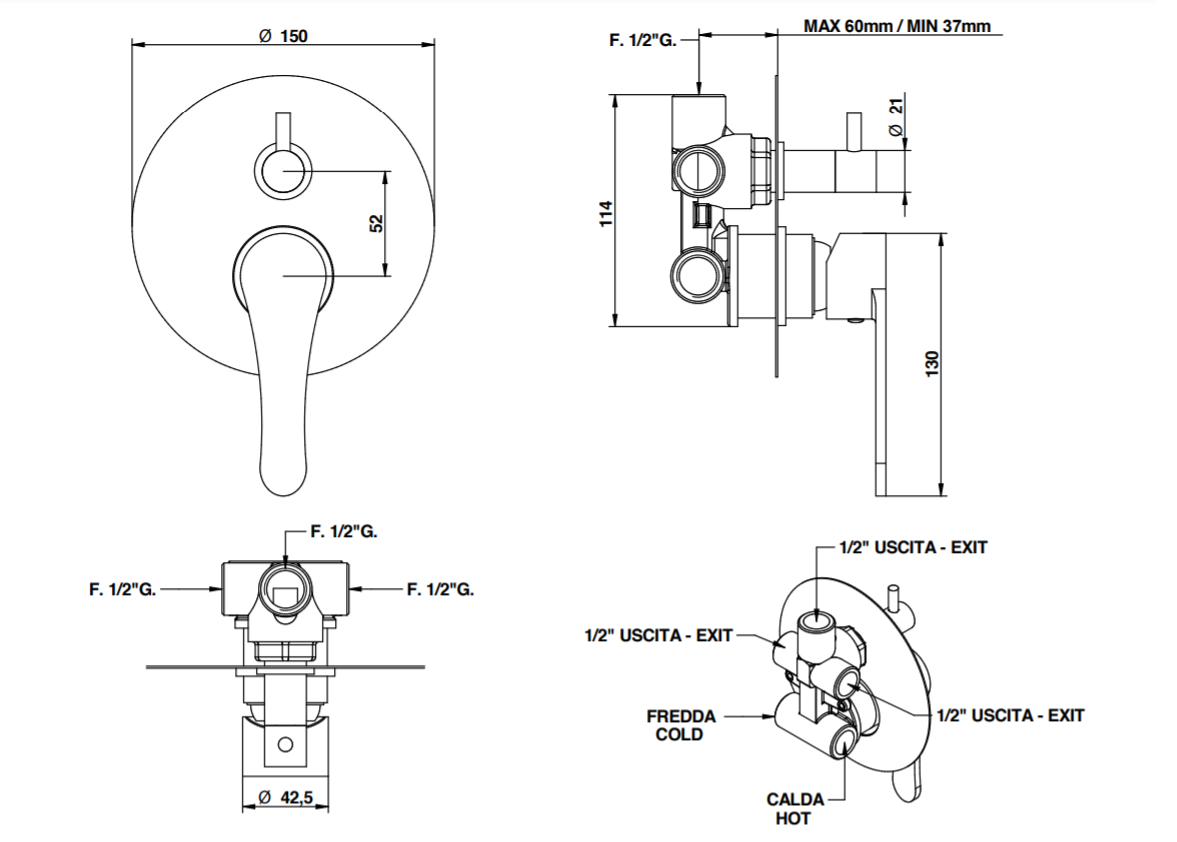 Bongio O'Clock Wall Mounted Mixer with 2 way mechanical Diverter